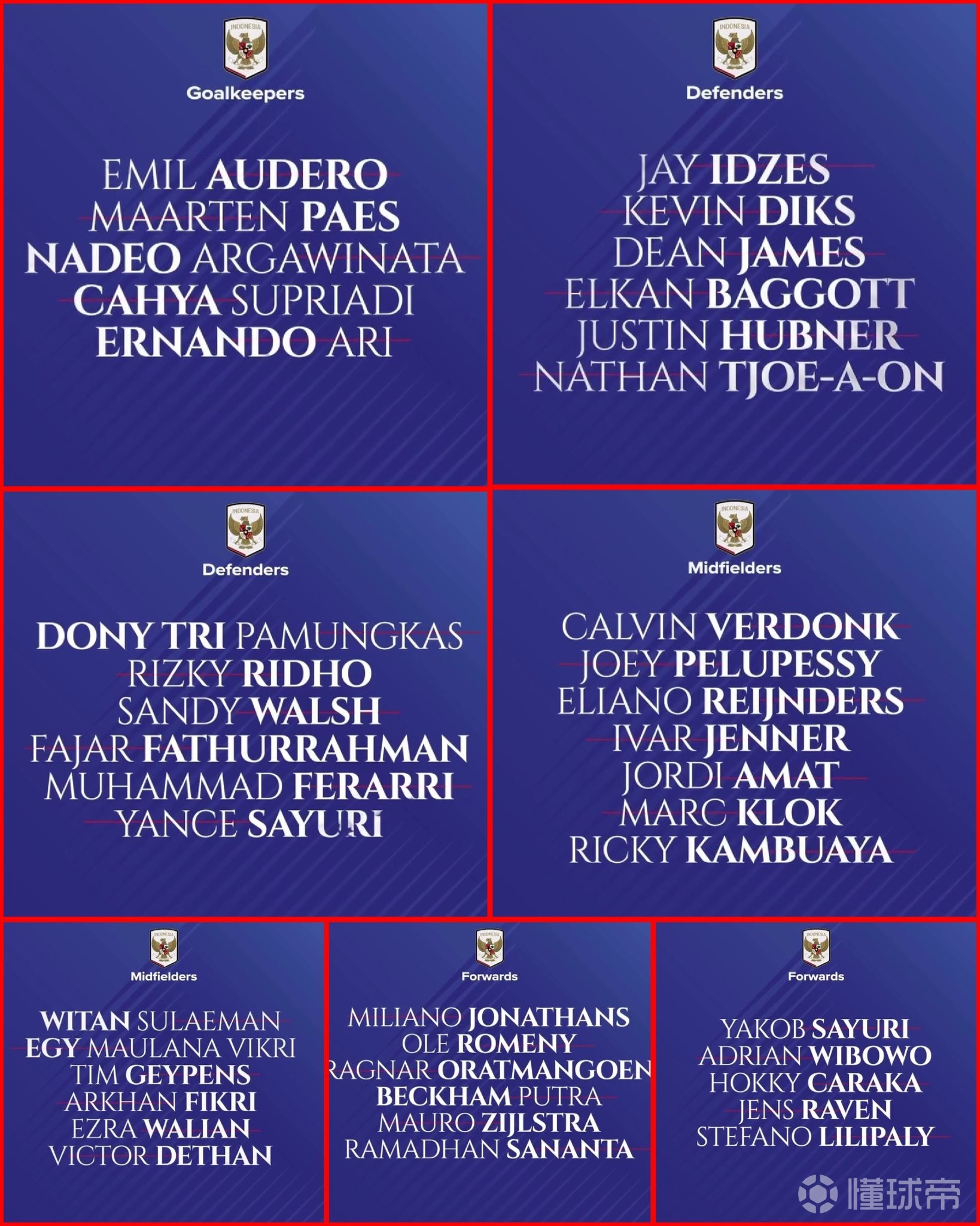杰伊-伊泽斯、凯文-迪克斯、迪恩-詹姆斯、巴戈特、贾斯汀-胡布纳、周亚安、多尼-帕蒙卡斯、里兹基-里多、桑迪-沃尔什、法贾尔-法图尔拉赫曼、穆罕默德-费拉里、扬赛-萨尤里